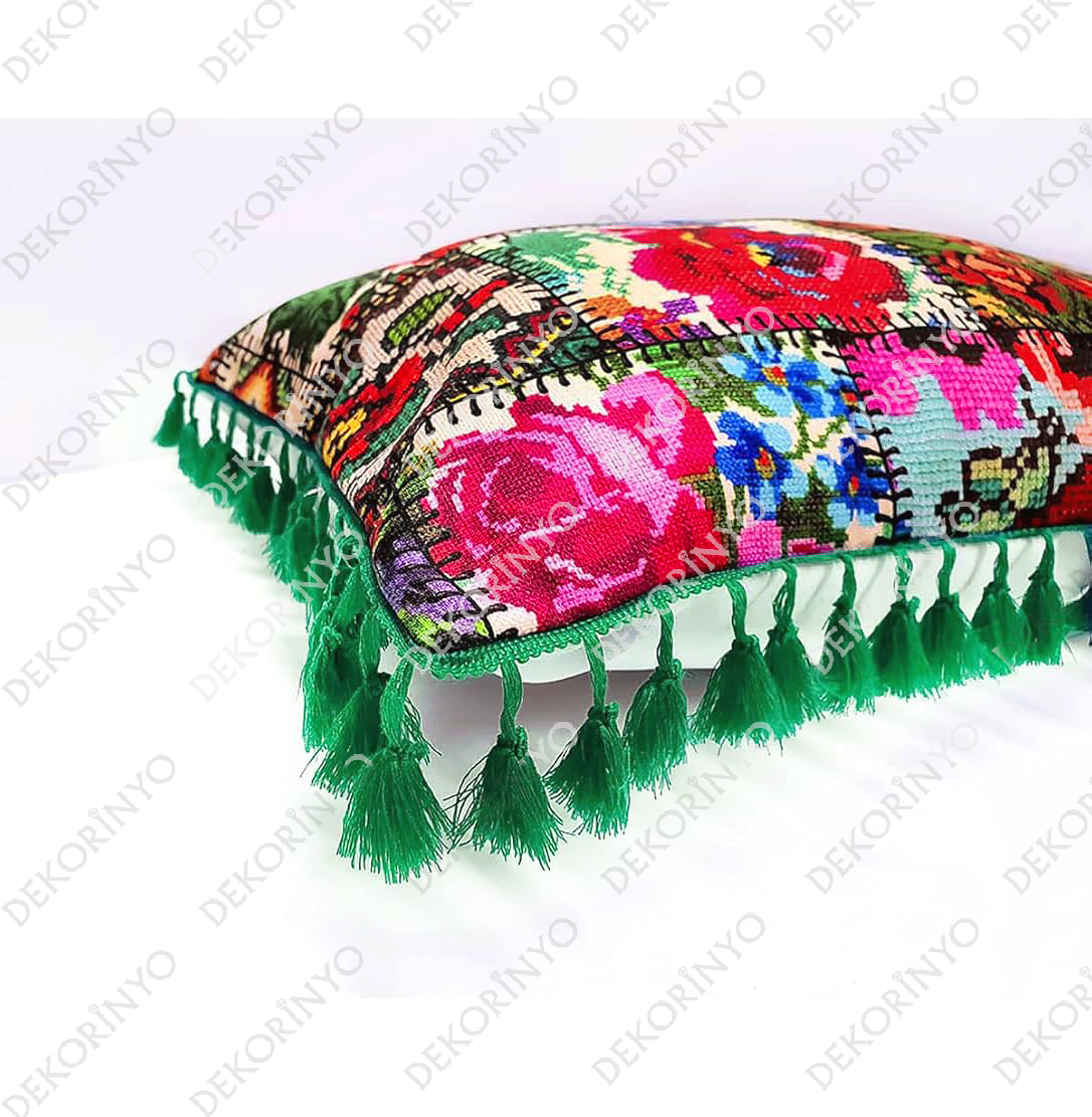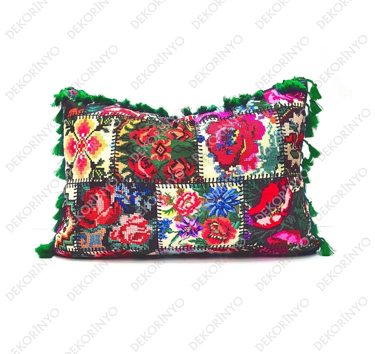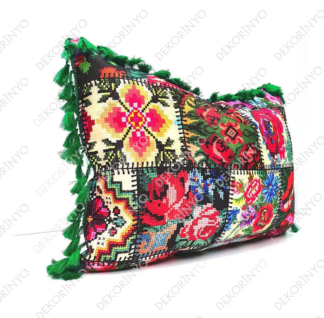 Kanaviçe Patchwork Desenli Püsküllü Dikdörtgen Kırlent Ürün Özellikleri: